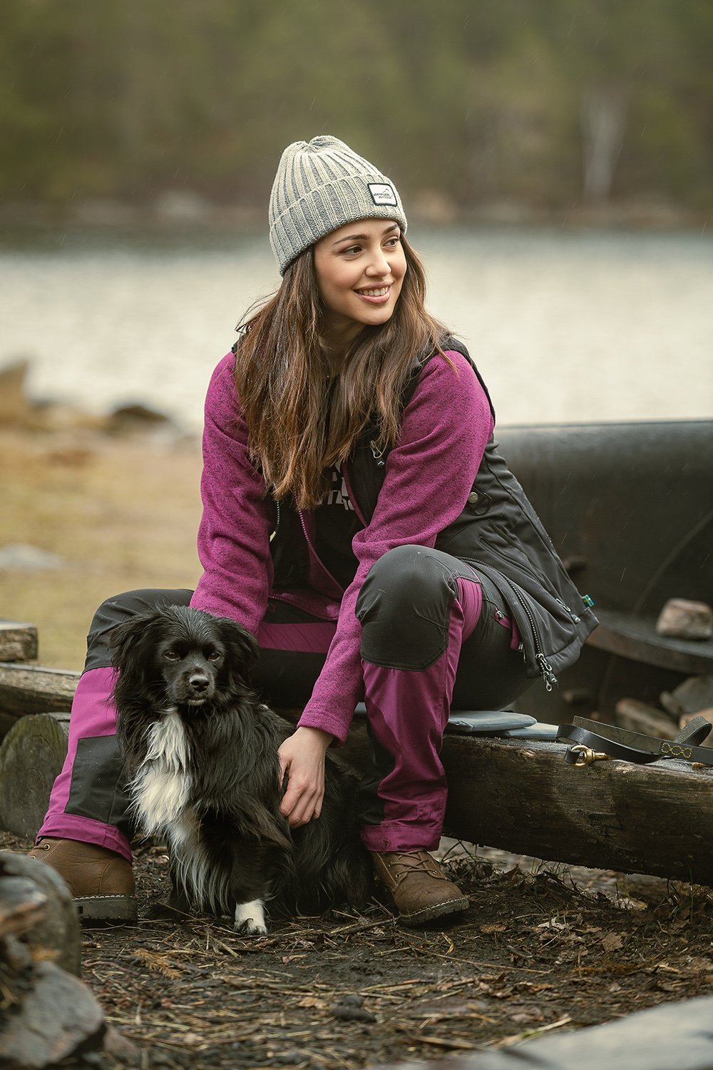 Top photo: New Active Stretch Pants in Fuchsia, Adventure Fleece in Fuchsia, Softshell vest in Black, Reflex Beanie in Gray.