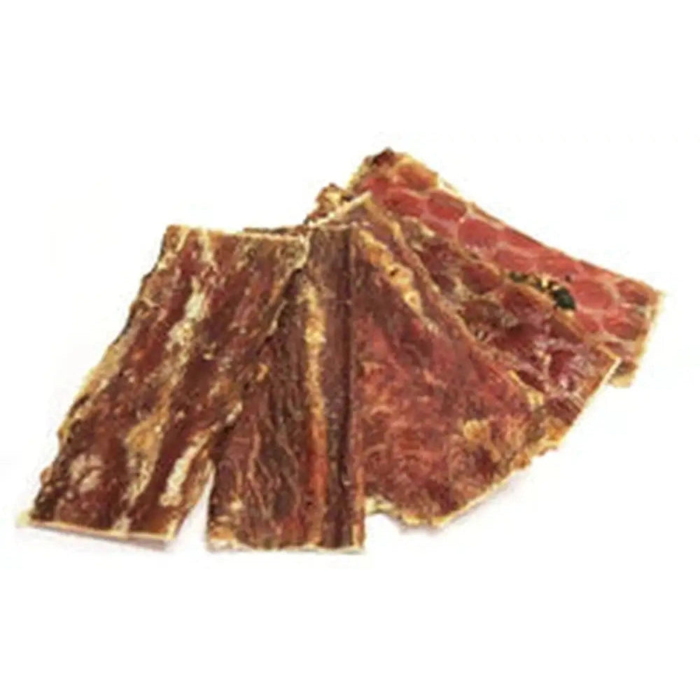 Description: Made of beef esophagus split down the center and flattened into a strip. Each piece is approximately 6 inches long, though there will be variations in length and shape. The texture is similar to a firm jerky, and pieces can be folded and broken off each strip.