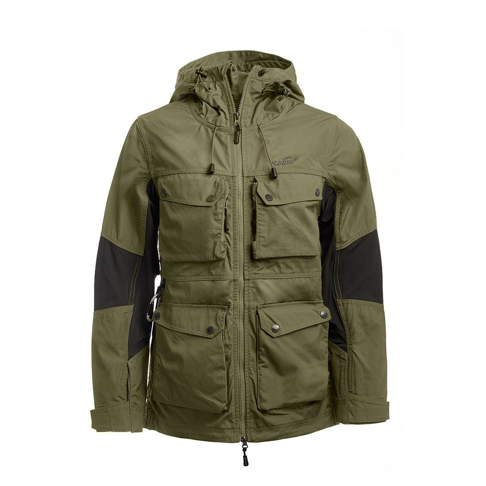 The Arrak Hybrid is designed for comfort and freedom of movement. Made from a durable polyester-cotton blend with stretch side panels, it offers breathability and flexibility. Ventilation zippers keep you cool, while multiple pockets—including a waterproof-lined one—securely store all your essentials. The adjustable hood, sleeves, and front zipper provide a perfect fit, and water- and stain-resistant fabric keeps you ready for any outdoor activity. Stay comfortable and prepared on your next adventure with this versatile jacket.