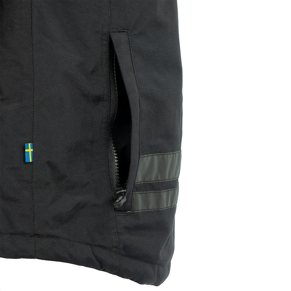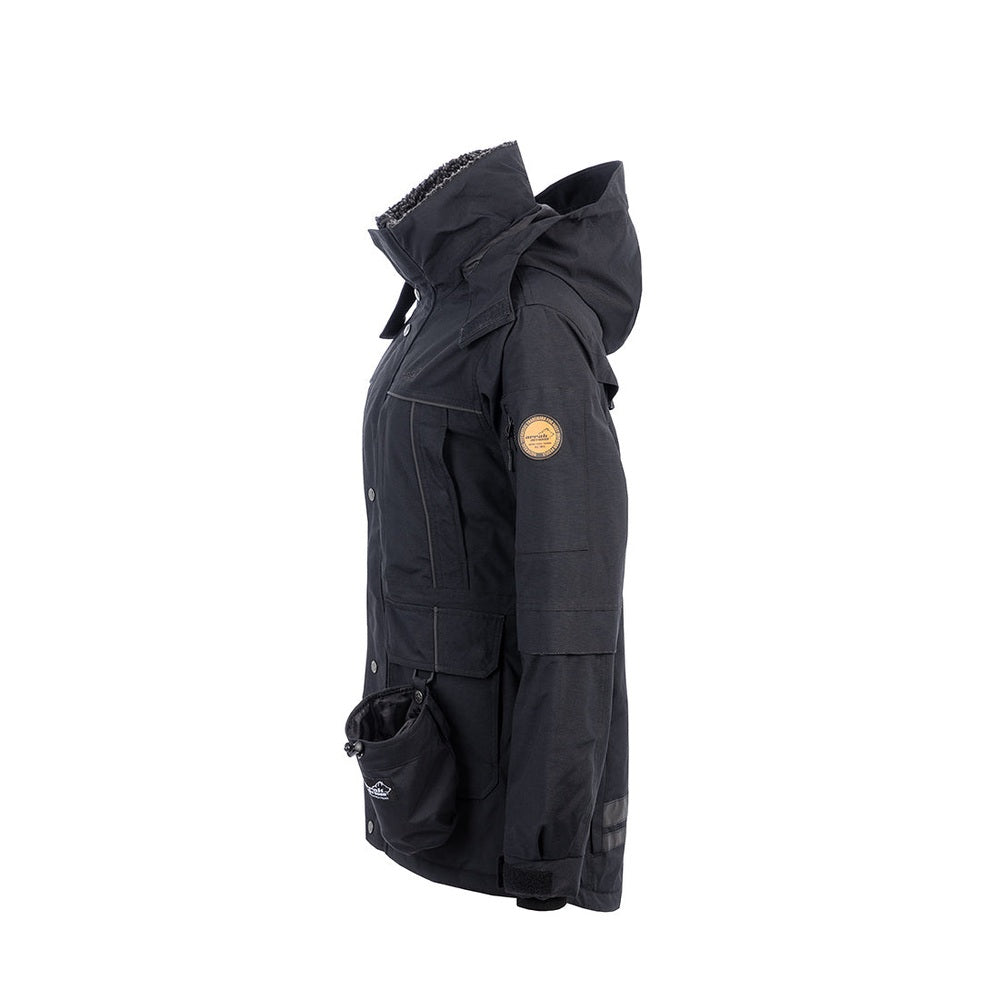 Our insulated jacket can be layered to suit varying cold conditions. Soft teddy fabric in the collar. Adjustable hood that is removable. You can fold up the reflectors on the arms when you go for an evening walk, and if you are going to town, you can easily hide the reflective material on the front and the back. The jacket features a large back pocket with a zipper and eight pockets at the front, four of which are hand pockets lined with microfleece, ideal for keeping your hands warm when you're cold. On one lower pocket, a removable candy pocket can also be used separately on a belt. On the lower pocket, there is also an output hole on the right front pocket for dog bags. At the cuffs, there is also a knitted cuff with a thumb grip.